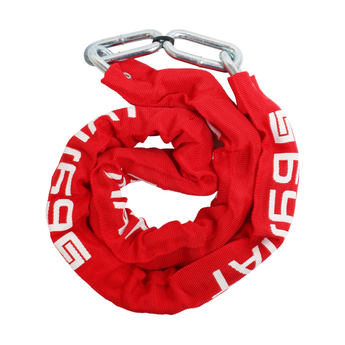 Цепь закаленная легированная сталь с красным тканевым покрытием используется совместно с навесными U-образными замками с диаметром дужки не более 16мм. Относится к механическим противоугонным средствам для скутеров, мопедов и мотоциклов. Синтетический водонепроницаемый чехол защищает цепь от пыли и грязи, а лакокрасочные покрытия транспорта — от повреждений. Толщина звена — 8 мм. Длина — 1,2 м. Во избежание перерубания цепи обычным зубилом сцепка производится на расстоянии от земли. Чтобы усложнить перепиливание, цепь фиксируется без натяжки. Не рекомендуется длительная стоянка транспортных средств в непросматриваемых, безлюдных и слабоосвещенных местах. Преимущества цепи * Устойчива к коррозии. * Имеет большую прочность при малом весе, экономит место при хранении и транспортировке. * Может использоваться для сцепки любых подходящих элементов (запирания распашных ворот, защиты детских колясок, велосипедов, садовых инструментов). * Более устойчива, чем трос, ко всем видам деформации.