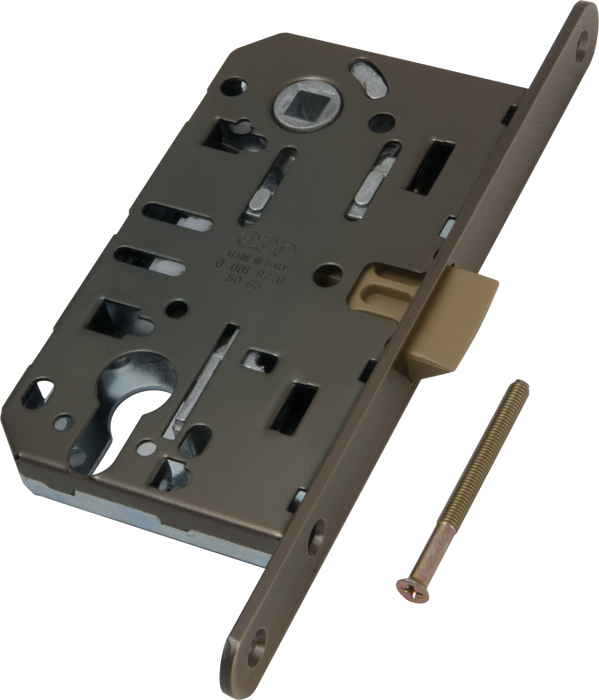 B01103.50.12 Замок межкомнатный под цилиндр в цвете античная бронза с пластиковым язычком серии MEDIANA EVOLUTION отличается бесшумностью при закрывании. Защелка разработанна инженерами компании AGB и объединяет в себе надежность, качество используемых материалов, точность механических соединений и инновации. Все замки серии Evolution имеют один размер и взаимозаменяемы между собой.