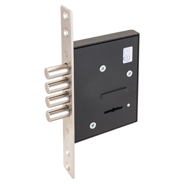 Четыре цилиндрических ригеля диаметром 11,5мм, вылет 22мм. Удаление ключевого отверстия 51,5мм. Стальная торцевая планка, покрытие - никель, ширина планки 23мм. 3 ключа.
