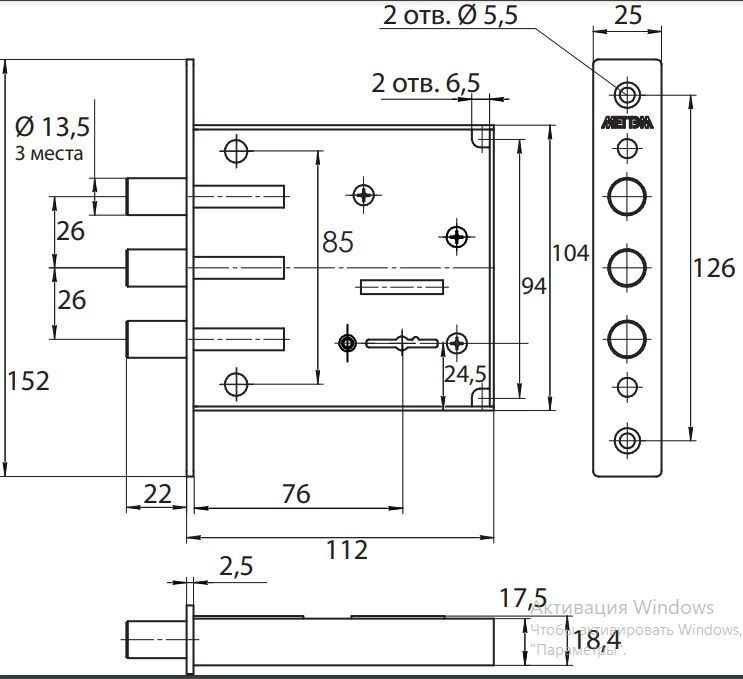 диаметр ригелей 14мм, вылет ригелей 22мм, длина ключа (от ручки до бородки) 48 мм