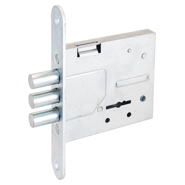 Три цилиндрических ригеля диаметром 11мм, вылет 21мм. Удаление ключевого отверстия 51мм. Стальной оцинкованный корпус. Ширина торцевой планки 22мм. Заявленная секретность 500 кодовых комбинаций.