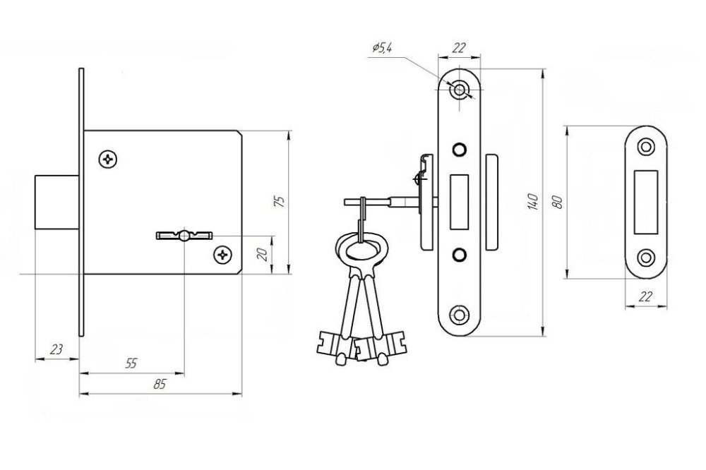 Предназначен для установки в деревянные двери толщиной до 45мм, правого и левого открывания. Стальной ригель прямоугольного сечения, вылет 22мм. Стальной корпус, покрыт гальваническим покрытием. Удаление ключевого отверстия 55мм. Комплектация: замок, 3 ключа, ответная планка, накладки, шурупы для крепления.