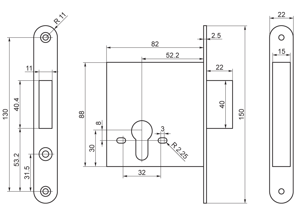 Прямоугольный ригель, вылет 22мм. Удаление ключевого отверстия 55мм. Стальной оцинкованный корпус. Никелерованная торцевая планка, ширина планки 22мм.