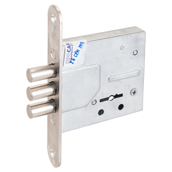 Три цилиндрических ригеля диаметром 11мм, вылет 21мм. Удаление ключевого отверстия 51мм. Стальной оцинкованный корпус. Ширина торцевой планки 22мм. Заявленная секретность 250 000 кодовых комбинаций. Замок имеет защиту от высверливания. Изготовлен из высокопрочных материалов.