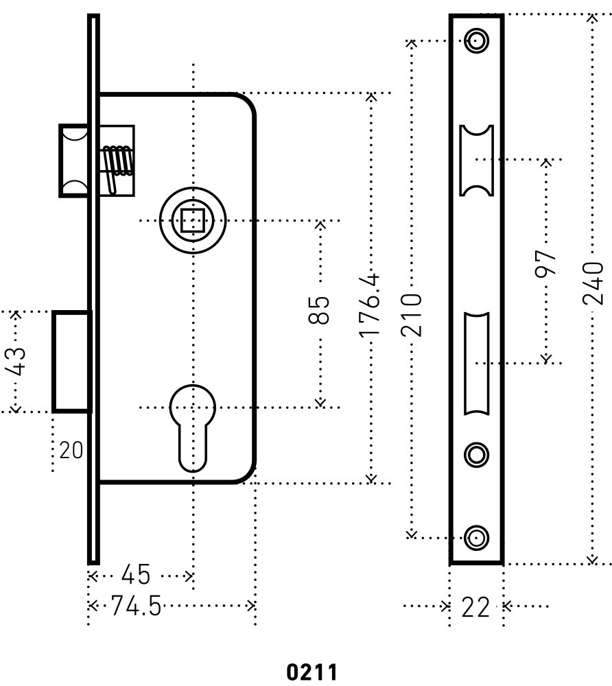 Прямоугольный ригель, вылет 20мм. Универсальная защелка. Стальной корпус с подшипником, покрыт полимерной краской. Межосевое расстояние 85 мм. Удаление ключевого отверстия 45мм. Материал ручек алюминиевый сплав.