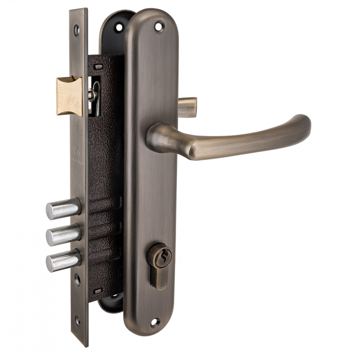 Три стальных ригеля круглого сечения диаметром 12мм, вылет 20мм. Универсальная защелка. Стальной корпус с подшипником, покрыт полимерной краской. Межосевое расстояние 85 мм. Удаление ключевого отверстия 45мм. Материал ручек алюминиевый сплав.