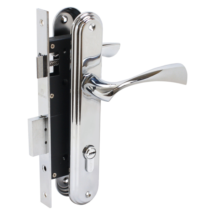 Замок врезной с ручками. Предназначен для установки в деревянные двери толщиной 35-45 мм, правого и левого открывания. Дверь может быть закрыта на защелку и открыта с помощью фалевой ручки при открытом засове замка.
