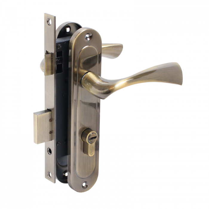 "Замок врезной с ручками. Предназначен для установки в деревянные двери толщиной 35-45 мм, правого и левого открывания. Дверь может быть закрыта на защелку и открыта с помощью фалевой ручки при открытом засове замка.