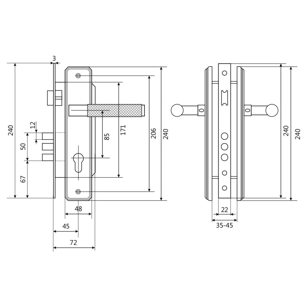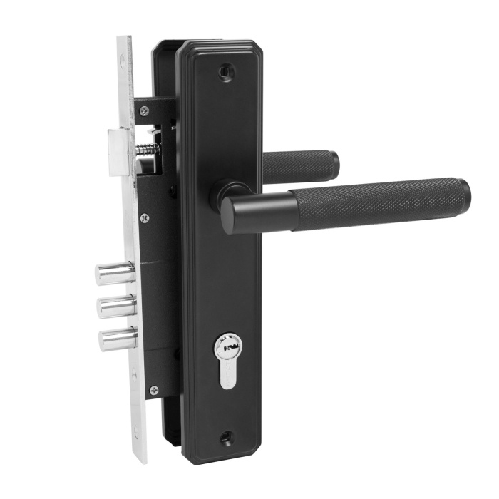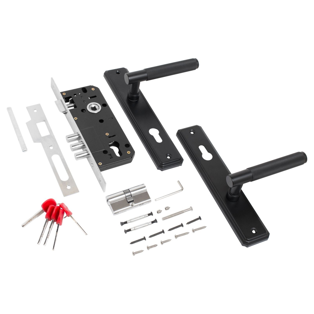 Замок врезной с ручками. Предназначен для установки в деревянные двери толщиной 35-45 мм, правого и левого открывания. Дверь может быть закрыта на защелку и открыта с помощью фалевой ручки при открытом засове замка. Три круглых стальных ригеля диаметром 12 мм и вылетом 20мм. Универсальная защелка. Стальной корпус с подшипником, покрыт полимерной краской. Межосевое расстояние 85 мм. Удаление ключевого отверстия 45мм. Материал ручек - сталь. Комплектация:латунный цилиндровый механизм 62мм, 5 перфоключей, ответная планка, винтовые стяжки.