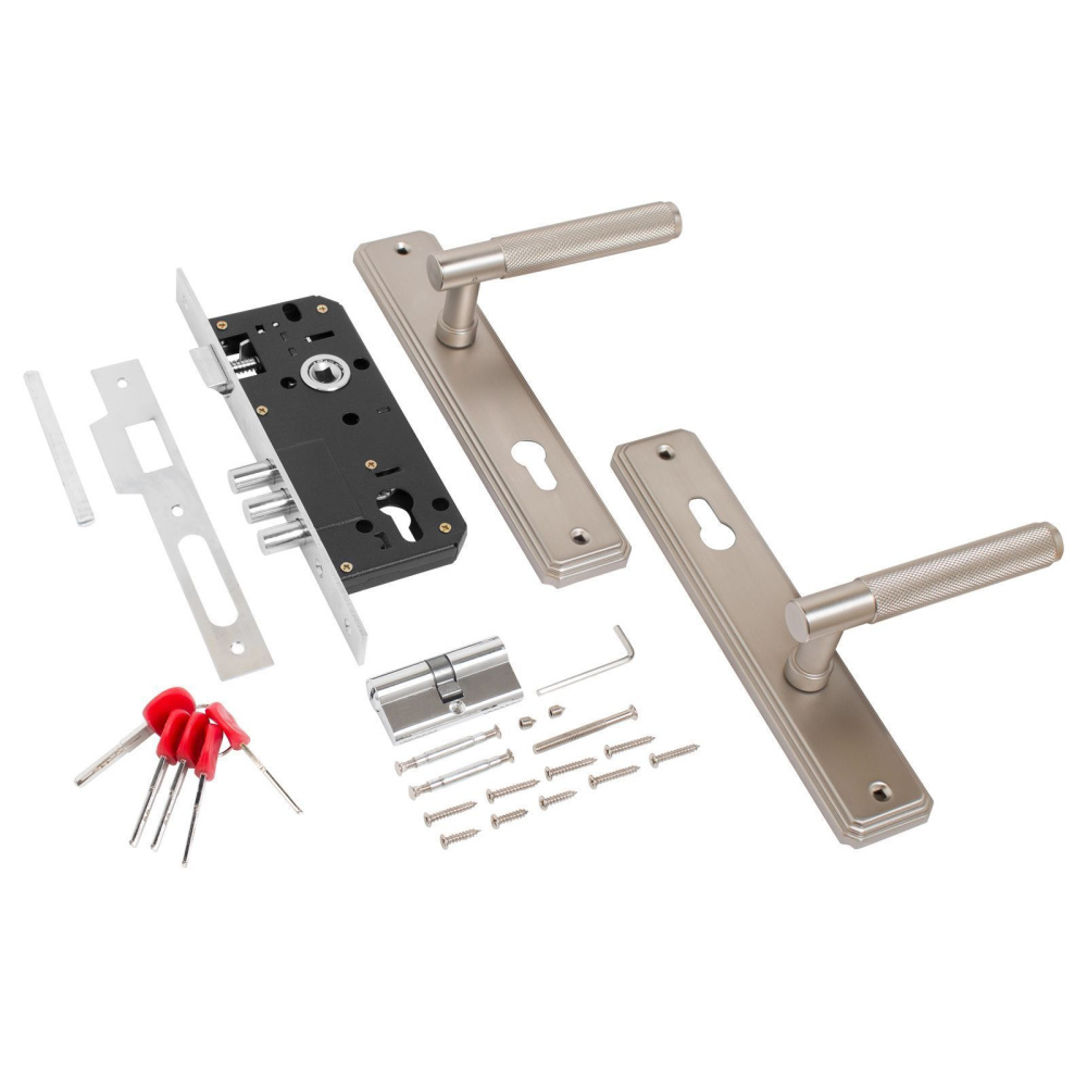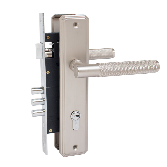 Замок врезной с ручками. Предназначен для установки в деревянные двери толщиной 35-45 мм, правого и левого открывания. Дверь может быть закрыта на защелку и открыта с помощью фалевой ручки при открытом засове замка. Три круглых стальных ригеля диаметром 12 мм и вылетом 20мм. Универсальная защелка. Стальной корпус с подшипником, покрыт полимерной краской. Межосевое расстояние 85 мм. Удаление ключевого отверстия 45мм. Материал ручек - сталь. Комплектация:латунный цилиндровый механизм 62мм, 5 перфоключей, ответная планка, винтовые стяжки.