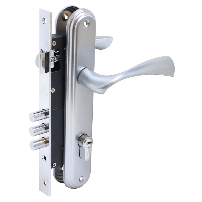 Три круглых стальных ригеля диаметром 12 мм и вылетом 20мм. Универсальная защелка. Стальной корпус с подшипником, покрыт полимерной краской. Межосевое расстояние 85 мм. Удаление ключевого отверстия 45мм. Материал ручек - сплав ЦАМ.