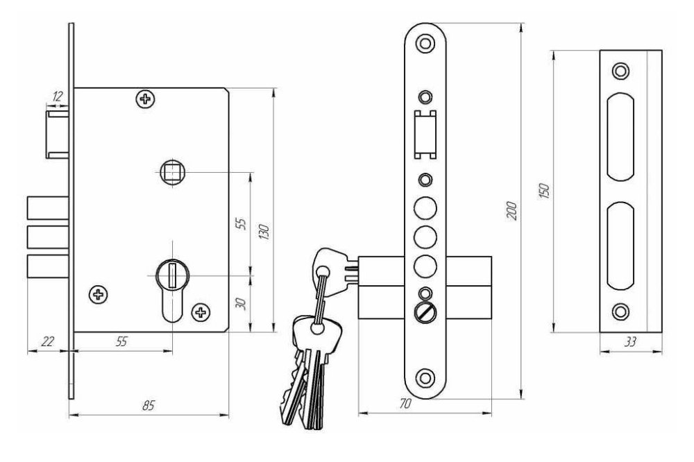 Комплектуется цилиндровым механизмом 70мм с 4 ключами, ответной планкой и стяжками.