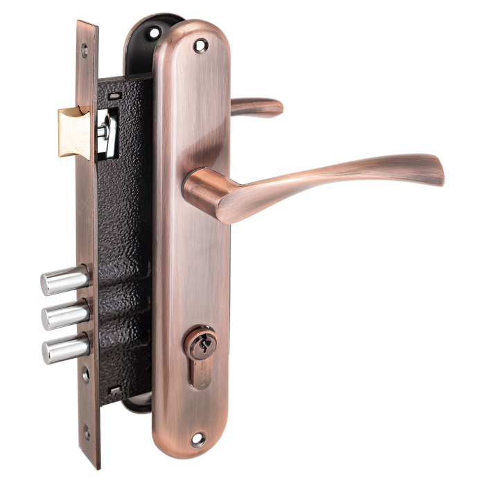 Три стальных ригеля круглого сечения диаметром 12мм, вылет 20мм. Универсальная защелка. Стальной корпус с подшипником, покрыт полимерной краской. Межосевое расстояние 85 мм. Удаление ключевого отверстия 45мм. Материал ручек алюминиевый сплав.