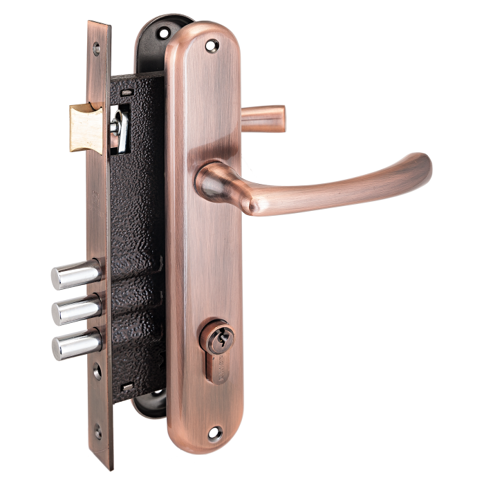 Три стальных ригеля круглого сечения диаметром 12мм, вылет 20мм. Универсальная защелка. Стальной корпус с подшипником, покрыт полимерной краской. Межосевое расстояние 85 мм. Удаление ключевого отверстия 45мм. Материал ручек алюминиевый сплав.