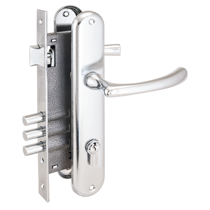 Три стальных ригеля круглого сечения диаметром 12мм, вылет 20мм. Универсальная защелка. Стальной корпус с подшипником, покрыт полимерной краской. Межосевое расстояние 85 мм. Удаление ключевого отверстия 45мм. Материал ручек алюминиевый сплав.