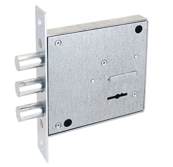Три цилиндрических ригеля диаметром 14мм, вылет 21мм. Удаление ключевого отверстия 75мм. Стальной корпус, покрыт полимерной краской.