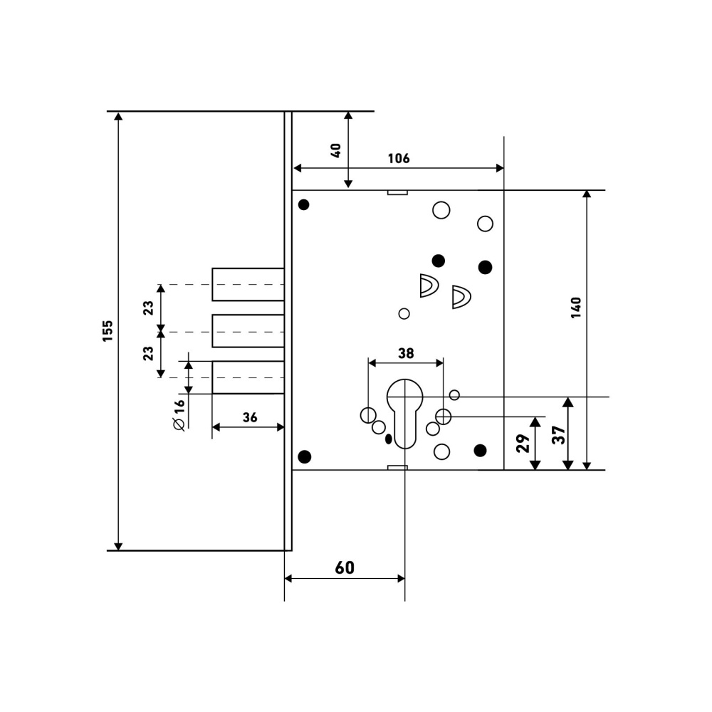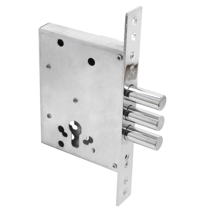 Корпус врезного цилиндрового замка Булат с тремя ригелями предназначен для установки во входные металлические двери. Стальной оцинкованный корпус. Универсальная установка, подходит для левых и правых дверей. Бэксет- 60мм. Выход ригелей- 36мм. Диаметр ригелей -16мм. Открывание-3 полуоборота. В комплект входят: крепежная фурнитура. Цвет лицевой планки- хром