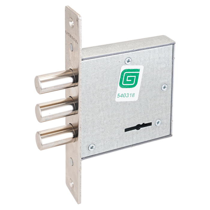Три цилиндрических ригеля, диаметром 13,5мм, вылет 26мм. Удаление ключевого отверстия 50мм. Стальная торцевая планка, покрытие - никель, ширина планки 26мм. 4ключа.