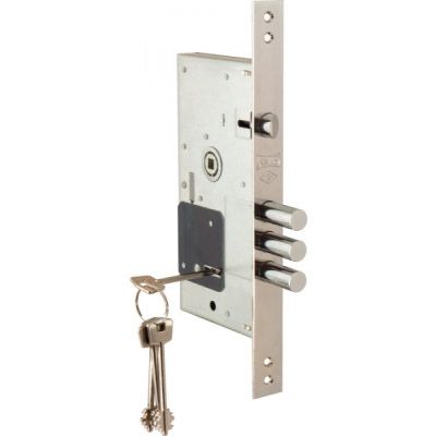 Замок врезной сувальдный с защелкой, предназначен для металлических дверей. Замок имеет засов из трех цилиндрических ригелей диаметром 16 мм, с максимальным вылетом 36 мм, и защелку, с приводом от ручки и ключа, диаметром 18мм. Удаление ключевого отверстия 60мм. Межосевое расстояние 85мм. Цвет торцевой планки - хром, размеры планки - 300х28. Количество оборотов ключа – 4. Габариты замка - 110х210х28мм. Комплектация - 5 ключей, дополнительная пластина на корпусе замка для защиты от высверливания. Привод ручки замка снабжен подшипником. Это обеспечивает мягкий и легкий ход, а так же значительно увеличивает срок службы замка.