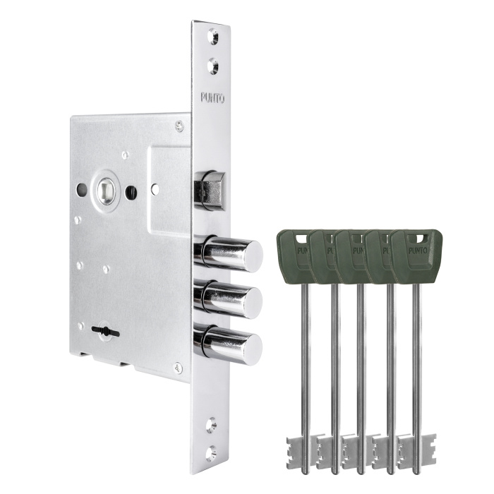 Замок врезной сувальдный Punto MDV30S с тремя ригелями предназначен для установки во входные и технические металлические двери, в качестве основного (нижнего). Стальной оцинкованный корпус. Универсальная реверсивная защелка, подходит для левых и правых дверей. Бэксет- 65 мм. Выход ригелей- 26 мм. Диаметр ригелей -16 мм. В комплект входят: врезной замок, 5 длинных ключа с эргономичной пластиковой головкой для дверей толщиной 40-120мм, крепежная фурнитура.