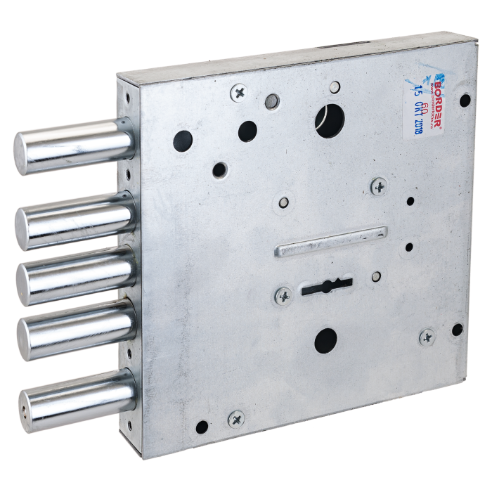 Замок врезной сувальдный для металлических дверей. Засов из пяти цилиндрических ригелей диаметром 15,7 мм, с максимальным вылетом 39,5 мм. Удаление ключевого отверстия 80 мм. Габариты замка - 150х144х28мм. Комплектация - 5 ключей. Броненакладка особой формы (с отверстием под ключ) из высококачественной каленой стали защищает не только сувальдный механизм, скрытый в корпусе замка, но и служит дополнительной защитой при попытке вскрытия двери «свертышем». В одном из ригелей расположен закаленный стальной стержень, обеспечивающий надежную защиту от перепиливания.