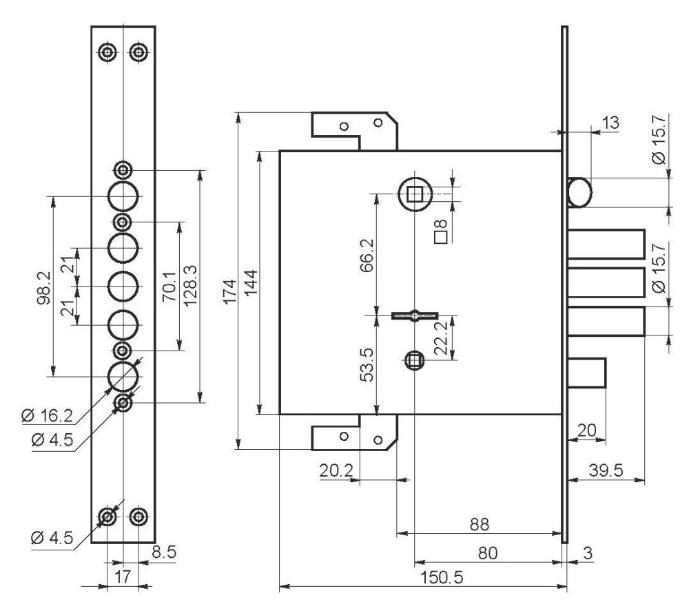 Замок врезной сувальдный с защелкой, задвижкой и тягами. Предназначен для металлических дверей. Замок имеет засов из трех цилиндрических ригелей диаметром 15,7 мм, с максимальным вылетом 39,5 мм, и универсальную защелку диаметром 15,7 мм. Вылет задвижки - 20 мм. Удаление ключевого отверстия 80 мм. Межосевое расстояние 66,2мм. Габариты замка - 150х144х28мм. Комплектация - 5 ключей, . Броненакладка особой формы (с отверстием под ключ) из высококачественной каленой стали защищает не только сувальдный механизм, скрытый в корпусе замка, но и служит дополнительной защитой при попытке вскрытия двери «свертышем». В одном из ригелей расположен закаленный стальной стержень, обеспечивающий надежную защиту от перепиливания.