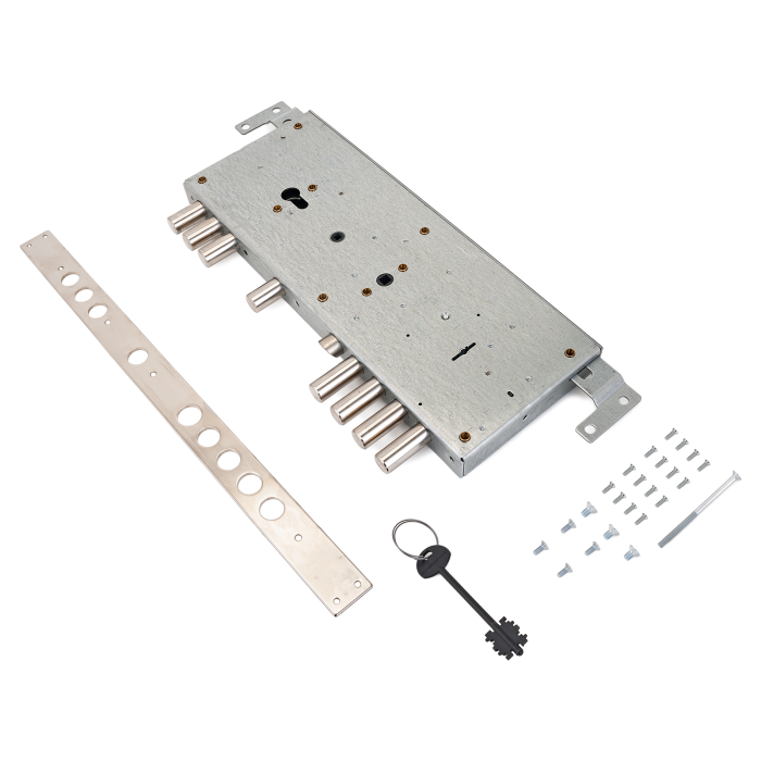 Замок врезной комбинированный с защелкой, задвижкой, тягами и кодовым ротором. Правый. Предназначен для металлических дверей. Замок имеет засов из восьми цилиндрических ригелей из стали диаметром 18мм, с максимальным вылетом 37,7мм (30мм для цилиндрового замка и 26мм - для задвижки). Вылет тяг 19мм. Удаление ключевого отверстия 63мм. Межосевое расстояние 100мм. Толщина полотна двери: 40-75 мм. Количество оборотов ключа – 2 (сув.), 2 (цилинд.). Габариты замка - 400х145х35 мм. Комплектация - монтажный кодовый ротор с монтажным ключом, основной кодовый ротор с 5 ключами, съемная торцевая планка. Встроенная бронепластина в корпусе замка надежно защищает от высверливания. В случае потери ключа, смена секрета осуществляется путем замены кодового барабана, без демонтажа замка из двери.
