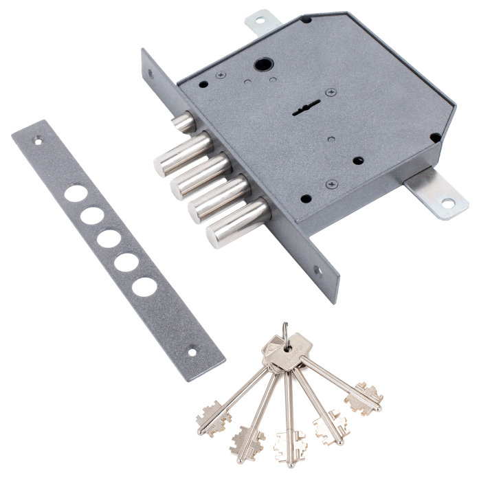 Запирание поворотом ключа обеспечивает ригель, имеющий четыре пальца диаметром 17 мм с вылетом 42мм. Дополнительные тяги имеют ход 20 мм и обеспечивают запирание двери вверху и внизу. Защелка обеспечивает фиксацию двери и приводится в действие ручкой.