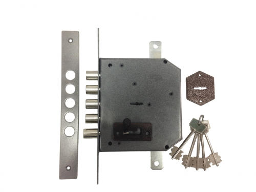 Замок врезной с четырехпалым ригелем, засовом типа "карабин" диаметром 17 мм с вылетом 23 мм, двумя дополнительными тягами и 8и-сувальдным блокирующим механизмом сейфового типа. Замок сертифицирован 3 классом по ГОСТ 5089-2011, сохраняет работоспособность после попадания в скважину посторонних предметов. Запирание двери в трёх направлениях обеспечивает повышенную сопротивляемость к взлому и высокую степень защиты. Выпускается правого и левого исполнения. Толщина корпуса замка 24 мм. Основной засов, состоящий из четырех пальцев диаметром 17мм, имеет вылет 42 мм и приводится в действие с помощью ключа, дополнительные тяги имеют ход 20 мм и обеспечивают запирание двери вверху и внизу. Внутренний затвор работает по типу затвор "карабин".