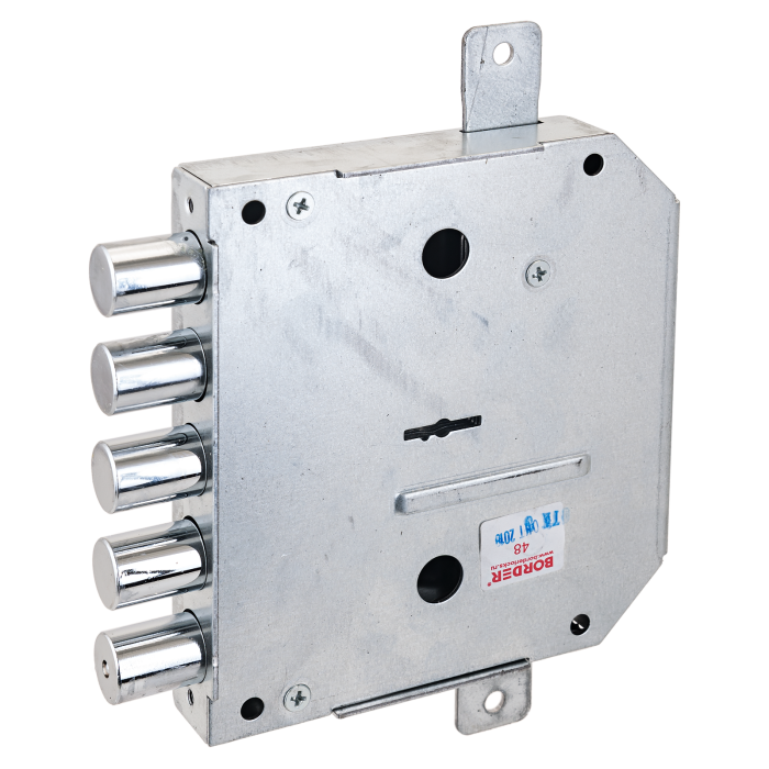 Замок врезной сувальдный с тягами для металлических дверей. Засов из пяти цилиндрических ригелей диаметром 17,7 мм, с максимальным вылетом 40 мм. Удаление ключевого отверстия 65,5 мм. Габариты замка - 137х145х30мм. Комплектация - 5 ключей. Броненакладка особой формы (с отверстием под ключ) из высококачественной каленой стали защищает не только сувальдный механизм, скрытый в корпусе замка, но и служит дополнительной защитой при попытке вскрытия двери «свертышем». В одном из ригелей расположен закаленный стальной стержень, обеспечивающий надежную защиту от перепиливания.
