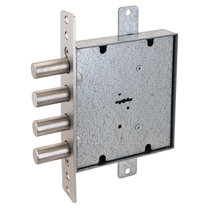 Замок врезной сувальдный для металлических дверей. Засов из четырех цилиндрических ригелей диаметром 18,5 мм, с максимальным вылетом 40 мм. Удаление ключевого отверстия 64 мм. Количество полуоборотов ключа - 4. Габариты замка - 135х146х32мм. Комплектация - 5 ключей, съемная торцевая планка. Замок имеет защиту от вскрытия замка отмычкой, защиту от высверливания стойки ригеля и защиту от вскрытия методом проворота.
