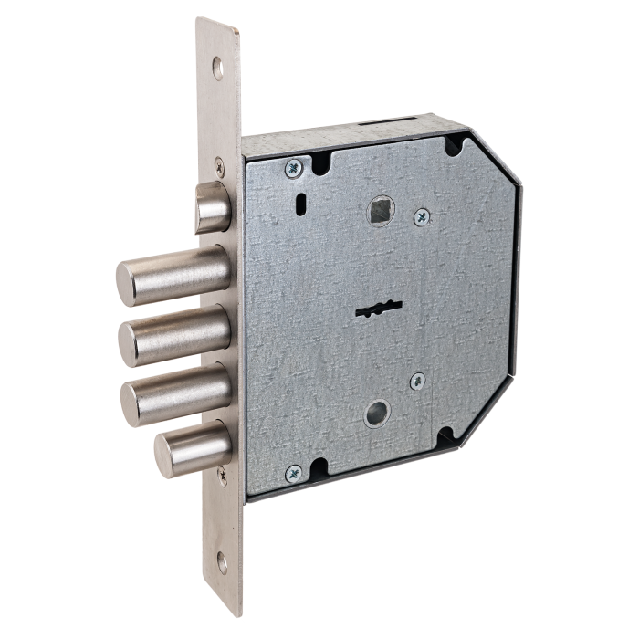 Замок врезной сувальдный с защелкой и задвижкой для металлических дверей. Замок имеет засов из трех цилиндрических ригелей диаметром 18 мм, с максимальным вылетом 40 мм, задвижку диаметром 18 мм, вылет 26,4 мм, и защелку диаметром 20мм. Удаление ключевого отверстия 64 мм. Межосевое расстояние - 42 мм до защелки и 47 мм до задвижки. Количество полуоборотов ключа - 4. Габариты замка - 135х146х30мм. Комплектация - 5 ключей. Замок имеет защиту от вскрытия замка отмычкой, защиту от высверливания стойки ригеля и защиту от вскрытия методом проворота.